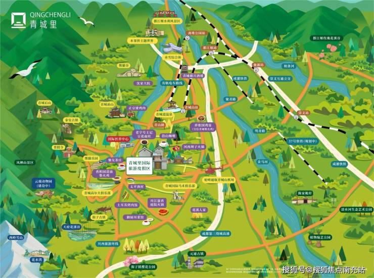 - **生活配套**:项目自建国际旅游商业特色巷子和全球精品度假酒店,同时周边有青城山繁华街区以及原生态大型赶集市场,满足日常生活购物、娱乐等各种需求。- **生态配套**:临近青城山前山景区、药王庙、熊猫谷及熊猫繁殖基地等自然人文景观,还有规划中的云端动物园、普照寺等,让业主与大自然亲密接触,享受生态之美。- **康养配套**:周边医疗康养资源丰富,有惠生康复医院及中医疗养馆、青城山景区医院(约3.1公里)、大观镇卫生院(约3.6公里)、中医医院(三级乙等,约10公里)、都江堰市人民医院(三级乙等,约13公里);此外,五粮液集团打造的国际一流的医学中心、康养中心和森林康养度假酒店也已拿地,为业主的健康生活保驾护航。- **交通配套**: - **公路交通**:形成“三横三纵”交通网络,聚青路、驾青路、成青快速通道 、川西旅游环线、省道106、成灌高速,让出行畅通无阻。 - **轨道交通**:临近青城山快铁站,还有建设中的MTR有轨电车以及成都市域铁路S9线,便捷连接城市各处。 - **景区交通**:乘坐101、102、104、105路公交可轻松到达街子古镇,方便游览周边景点。