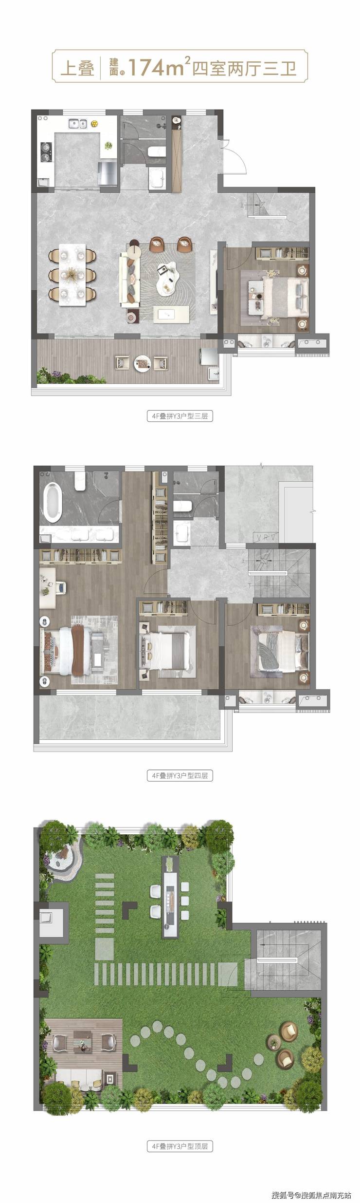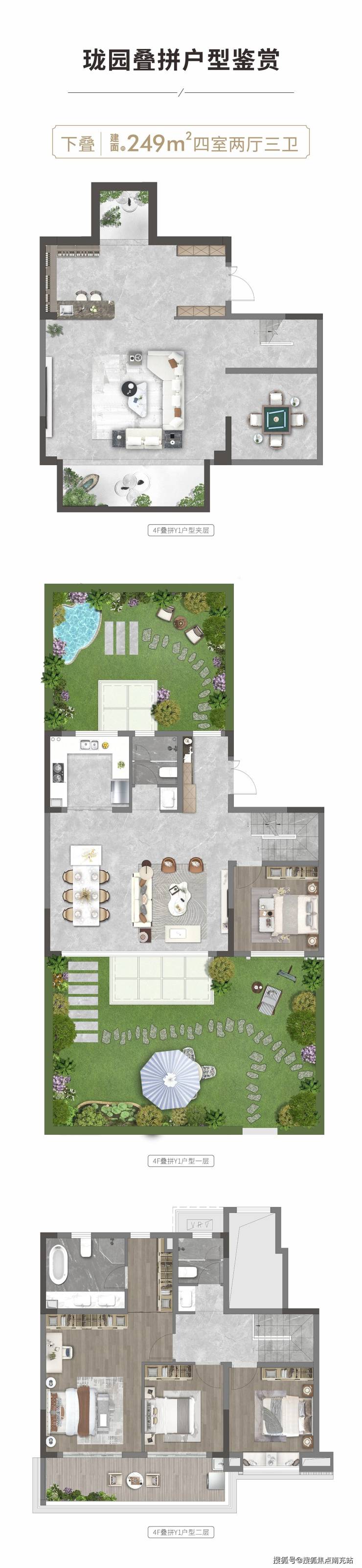 。2. **珑园叠拼户型** - 约 249㎡风景下叠,拥有南北双花园,超大夹层空间,拓展生活空间,享受花园生活乐趣。 - 约 174㎡全景上叠,配备瞰景星光露台,甲板式双阳台,可俯瞰美景,享受惬意时光。 - 4F 叠拼独立电梯入户,尊贵便捷