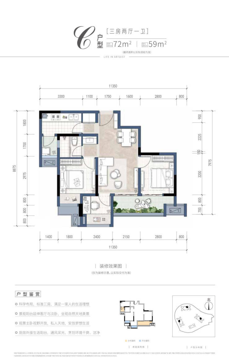 5、小中见大、真三房。得房率高达 99%,标配全景落地窗。