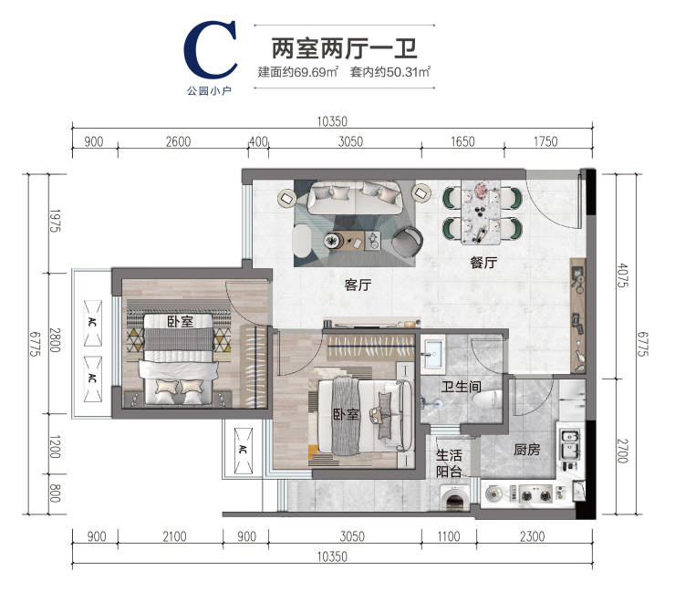 C:两室两厅一卫 建面约69.69㎡ 套内约50.31㎡