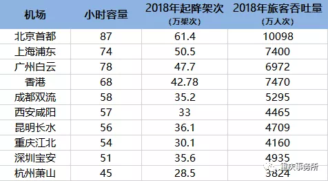 国内十大机场时刻容量等,数据截至2019年12月9日对比全国十大机场来看,目前重庆江北机场小时容量位居全国第8位;对比北上广差距明显。而在西部,也位居成都双流、西安咸阳和昆明长水机场三个主要竞争对手之后。其中,成都双流和西安咸阳机场,也刚刚调整时刻容量不久。但从获批时间上来看,两个机场比重庆江北机场早了一个月。作为西部排名前列拥有两个航站楼和三条跑道的机场,江北机场的时刻容量依旧较低,还有较大扩容空间。今年11月,《重庆国际航空枢纽战略规划》(2019—2035年)出炉。明确提出了“到2025年,实现年旅客吞吐量7500万人次,年货邮吞吐量80万吨以上”的中期目标。根据规划实施阶段,这个吞吐量目标,主要由江北机场来完成。2018年,江北机场旅客吞吐量为4159.5万人次,距离2025年的“小目标”,大约有3400万的差额。尤其是在时刻资源竞争日趋激烈的当下,内外因素均决定了,时刻争取依旧是重庆国际航空枢纽建设的工作重点之一。而这,除加快T3B航站楼和第四跑道的建设之外,还涉及空域情况、进离场程序、机场净空保护、机场协调营运能力等诸多方面。END