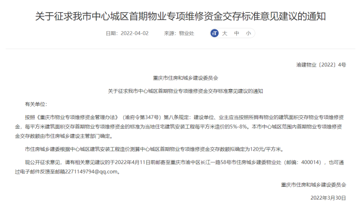 4月2日,重庆市住房和城乡建设委员会发布了《关于征求我市中心城区首期物业专项维修资金交存标准意见建议的通知》,提到根据中心城区建筑安装工程造价测算中心城区首期物业专项维修资金交存数额拟确定为120元/平方米。目前,市住建委正对该标准征求公开意见中。