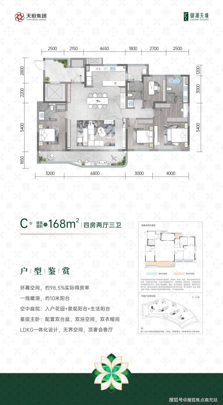 天恒御湖天境是天恒集团继“傲云系”之后,以“天境系”为名的又一高端住宅产品。项目以“时代之境、地脉之境、大师之境、无界之境”四境焕新升级,从规划到设计,无不彰显着匠心独运。项目以低容积率、高绿化率的设计理念,规划了建面约143-196㎡的无界高定大宅,每一户都能享受到极致的瞰湖视野。同时,项目还配备了高品质商业配套,满足业主的多元化需求。