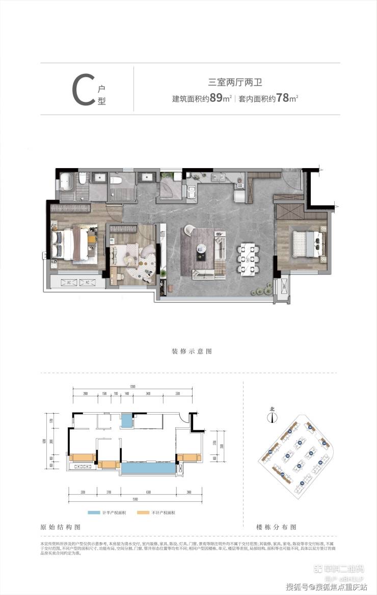 【总价】C户型:建面89㎡/套内78㎡,86-111万