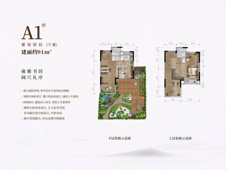 一梯四户下叠,建面109-111㎡,套三可改套四,花园30-80平,总价110-140万