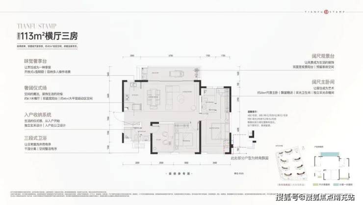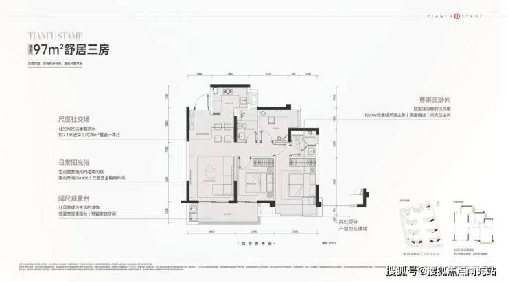 天投中海·天府合印首批次房源包括建面约97㎡、113㎡两大主力户型。两大户型均为套三双卫设计,在功能空间上完美契合了青年群体的置业需求。同时,从空间布局的设计上来看,满足了青年在生活上的舒适与尺度的双重要求。