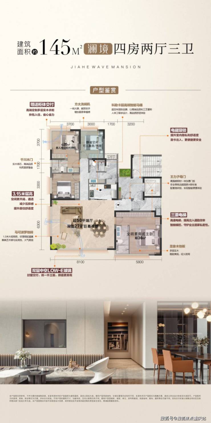LDKB一体化,连接超7m宽中庭向大面宽阳台,全景落地窗,视野开阔
