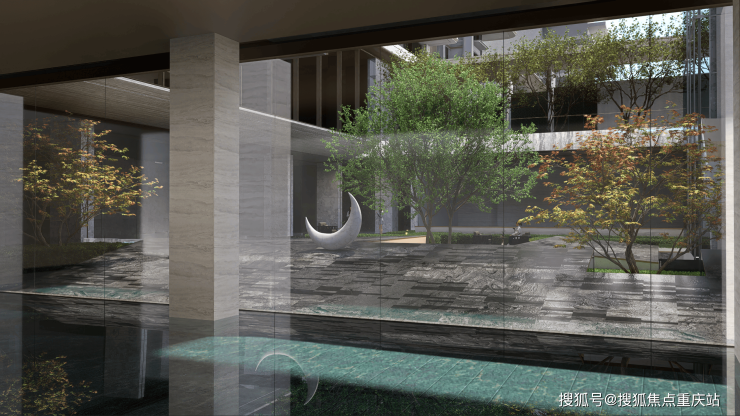 项目实景示范区约3800平米,穿过琉璃光瀑,则进入了星月水院。这里由一座上层的行政酒廊、下沉式会所、花园厅围合一座水院而成。庭院中央,汉白玉雕塑"琉璃皓月"静立水央,柔光倒映,宛若水中明月,意境悠远。四周,十二星宿主题水景环绕,点点灯光如银河洒落人间,此景故名"星月水院"。