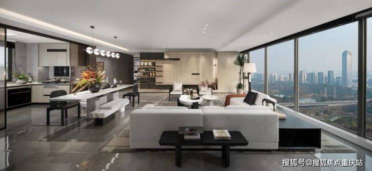 LDKB一体化设计,家庭社交系统全方位升级,一字排开的西厨岛台、餐厅、客厅,让生活与窗外环境合二为一。