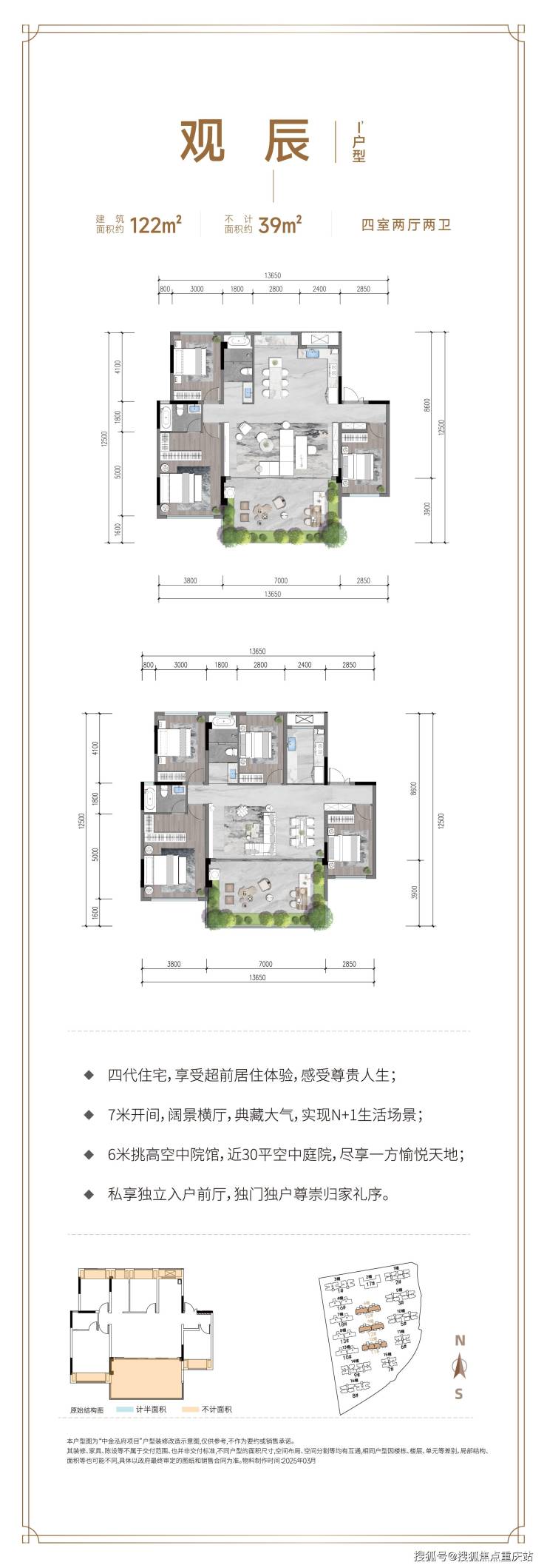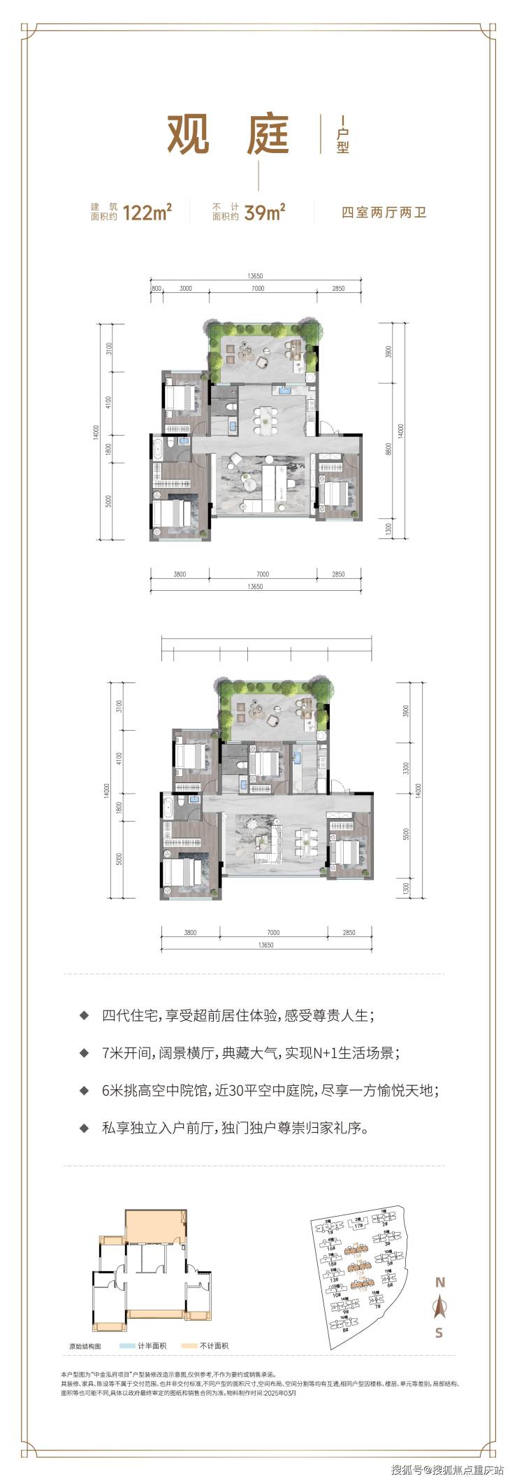 【创新重庆第四代高端人居,品质升级之作】中金泓府以高度严谨的态度进行产品调研和未来趋势研判,打造出更符合人本居住理念与人居习惯的第四代住宅。项目以1.49的超低容积率、30%的绿化率,以及1梯2户的高配置,搭配低密度纯板式通透户型,实现了从“垂直森林城市”向更高层次人居理想的升级蜕变。【一厅一庭六花园,园藏大美天地】项目精心打造约3.5万㎡墅景园林,融入世界级大师理念,首次将世界级画境莫奈花园引入重庆。归家礼序大厅,彰显尊贵身份;下沉式中庭园林,营造宁静优雅氛围;全龄化休闲健身空间,满足不同年龄段业主的需求。悦己、轻松、治愈的场景无处不在,让您处处皆能享受诗意生活。