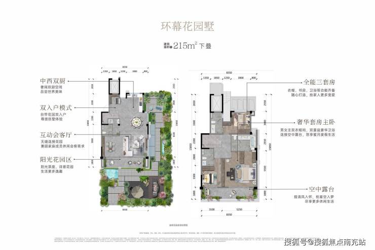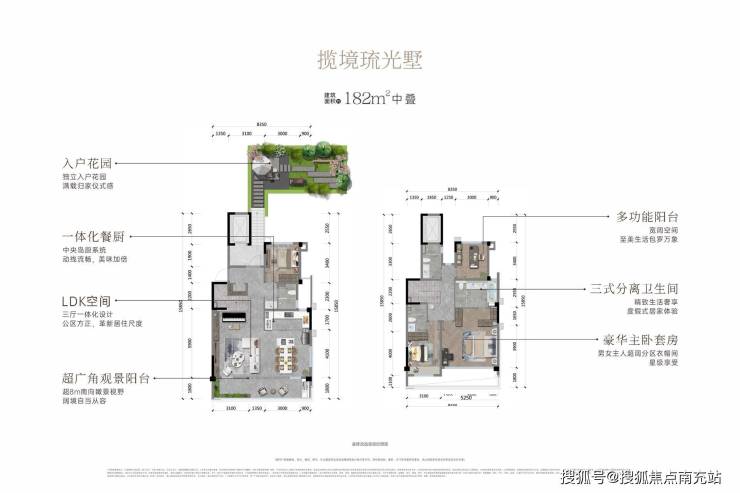 以建面约182㎡中叠为例,豪华主卧套房面积超过40㎡,约5.25m睡眠区面宽、男女双衣帽间、卫浴三分离盥洗,尺度与品质俱佳;
