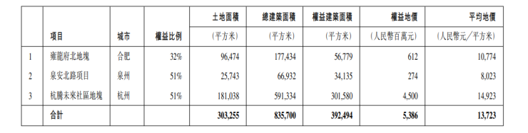 公告称,2022年1月新增三块土地储备(其中一块来自于收并购项目),总建筑面积83.57万平方米,权益建筑面积39.25万平方米,权益地价人民币53.9亿元。