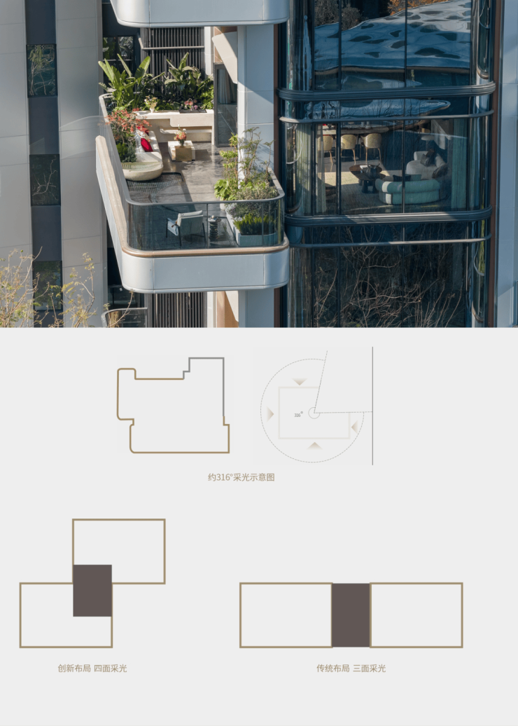 区别于传统板式结构,蝶形错位排布让每户拥有约316°,四面采光界面。市面上其它豪宅普遍为270°三面采光。