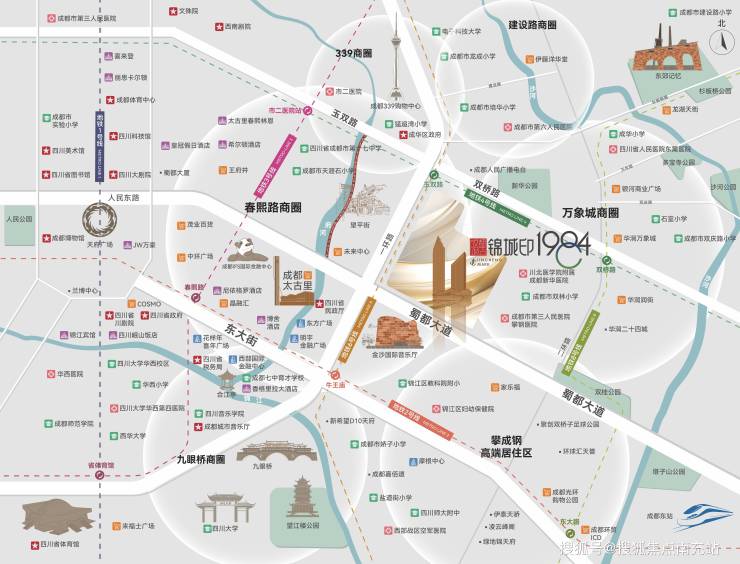 ①千亿商圈:项目所在的春熙路商圈,是成都乃至中西部经济实力最强、人气商气最浓、发展环境最优的区域。同时3km内涵盖天府广场商圈、水碾河商圈、万象城商圈、建设路商圈、攀成钢商圈,九眼桥商圈,千万级高端消费客流在此汇集。
