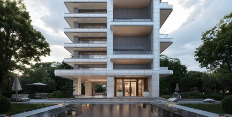 项目全奢级石材干挂,于水岸再次美学激荡,塑造建筑雕塑质感与稳固挺拔的形象,对话城市理想与高度