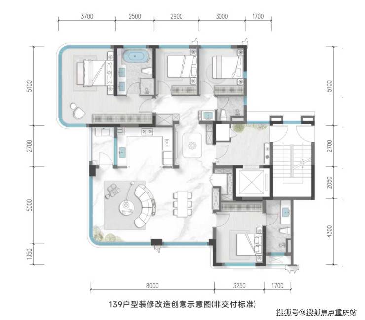 建面约 139㎡ 四室两厅两卫:270° 端厅设计,全景舱采光,约 3.1 米奢阔层高,超大景观阳台封窗交付,主卧奢配独立卫浴与步入式衣帽间,尺度感与舒适度拉满,匹配塔尖圈层居住理想。