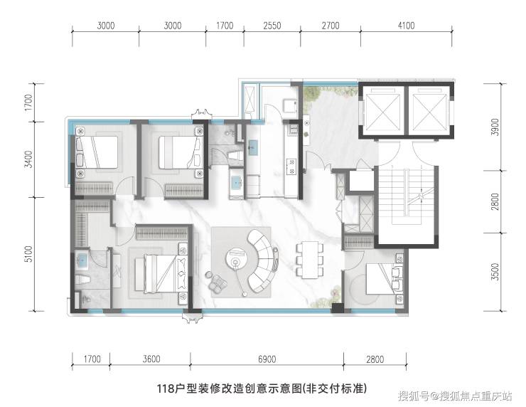 建面约 118㎡ 四室两厅两卫:四开间朝南,约 15 米南向大面宽,LDKB 一体化宽厅约 9.7 米,入户玄关搭配 800 库收纳系统,主卧套房带双衣帽间,空间方正实用,满足改善家庭全周期需求。