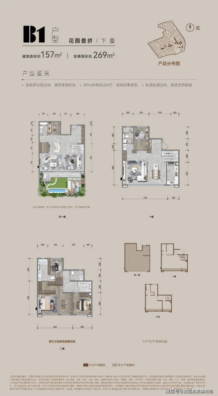 如建面约157㎡的花园下叠,实得面积约269㎡,利用台地自然高差,下沉式的花园庭院,让负一层也是全明空间,既可用作双会客厅,也能变成五房双主卧,同比350㎡以上的大平层,可以满足尺度、功能、庭院三合一的高改需求。