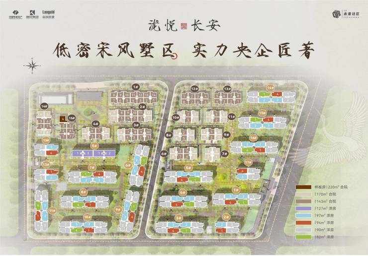 项目总占地112亩,体量15.6万方,总计1095户,车位1182个,车位比1:1,绿化30%,容积率1.5,项目分为东、西地块开发,打造墅区洋房和宋式合院