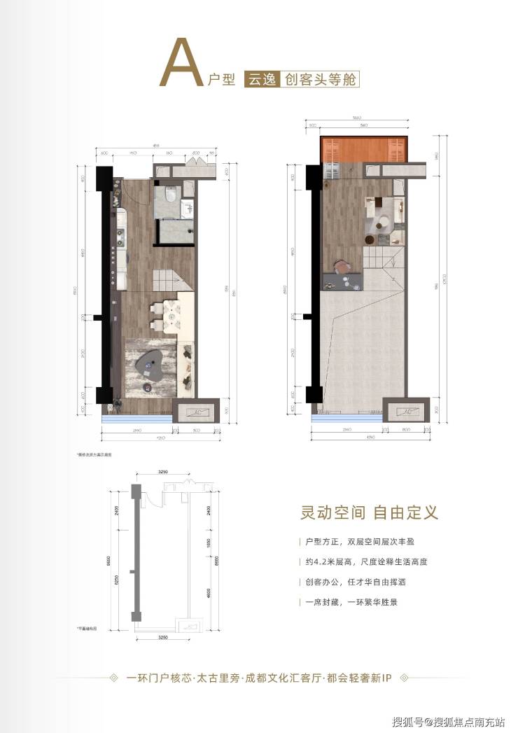 ### 【著作城芯臻品】项目预计首推B座办公类产品,层高4.2米,预计建面约40㎡,梯户比6T29,具备创客空间、商业办公等功能,功能灵活多样。### 【私藏绝版视野】在这里可坐拥峰层视野,向西眺望,春熙路 - 太古里商圈的繁华景象尽收眼底。### 【户型鉴赏】- **云逸 创客头等舱**