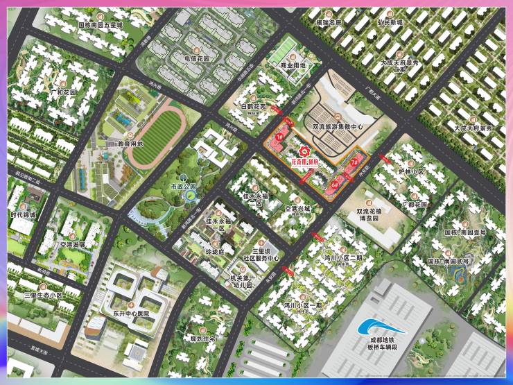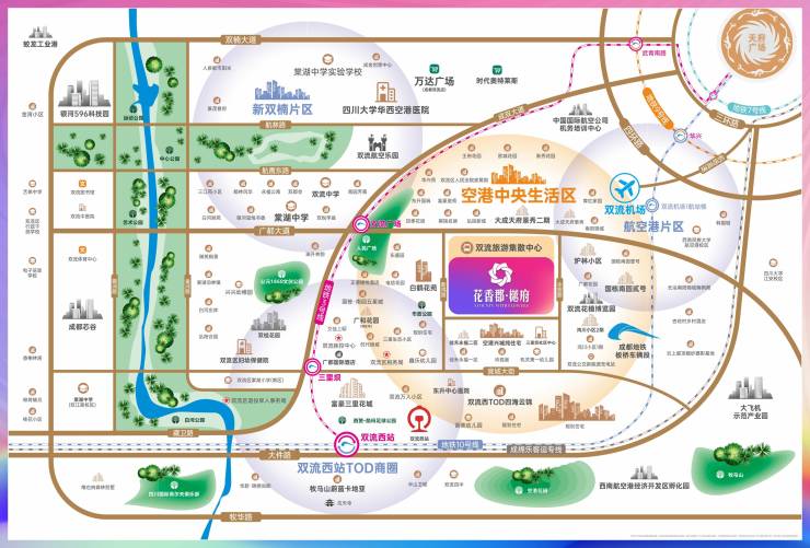 享双流旅游集散中心,双流花植博览园、东升中心医院配套齐全,核心生活居住区 囊括周边一公里10万+高质量消费人群日常生活配套服务