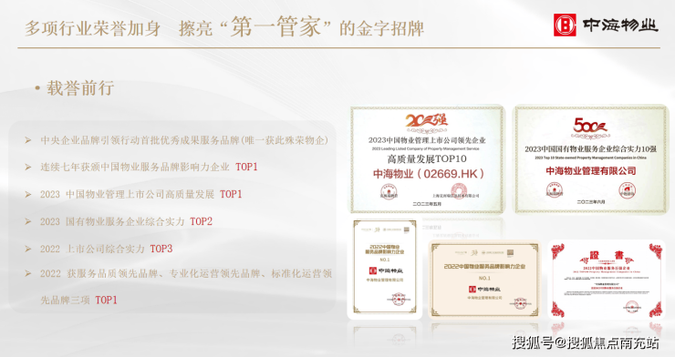 中海物业集团有限公司,隶属于中国建筑集团旗下中国海外集团,是首家在港上市的央企物业,开创多项行业先河,也是国家首批获得一级资质的物业管理品牌,拥有近40年不动产与客户全生命周期管理服务经验