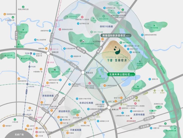 教育:金苹果幼儿园、新都区机关幼儿园、俞亭小学、香城小学分校、成都嘉祥七中外国语学校、新都蜀龙学校、三原外国语学校、成都实验外国语学校五龙山校区、成都狄邦肯思国际学校、石室中学北湖校区等中小学。