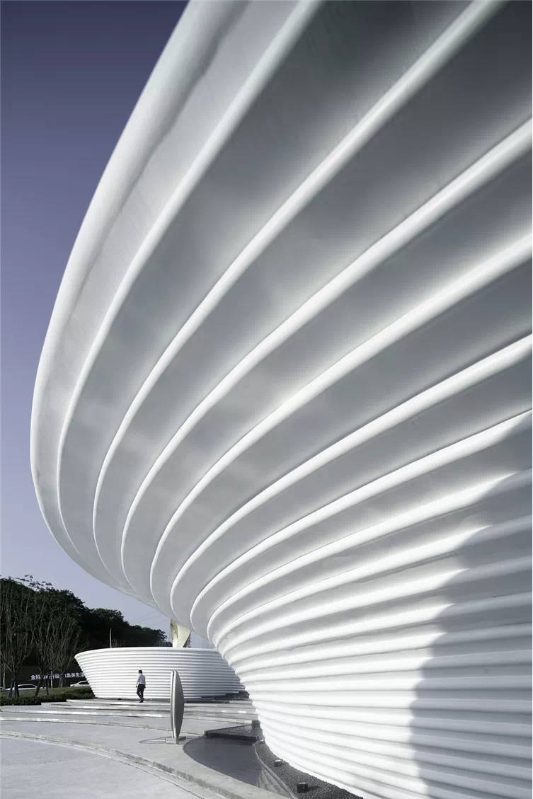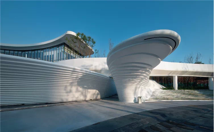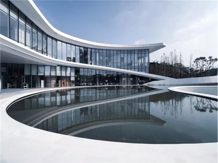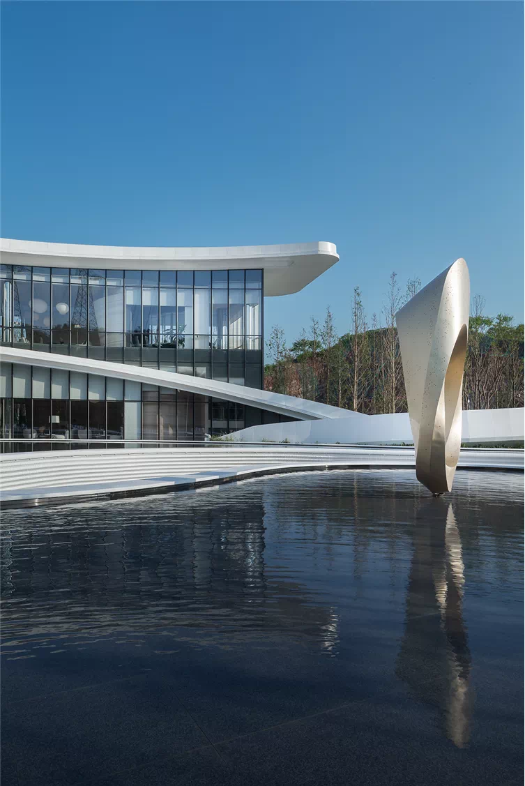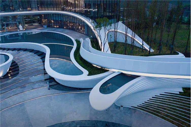 建筑整体风格现代简约,线条明朗,凸显高级静谧的生活基调。同时通过形态及空间的表达,提出“峡谷架桥”的概念,链接工业金融与生态居住的人居概念,彰显人文与功能齐备,自然与艺术共融的大社区概念。它是舒适、艺术、生态、永续的。