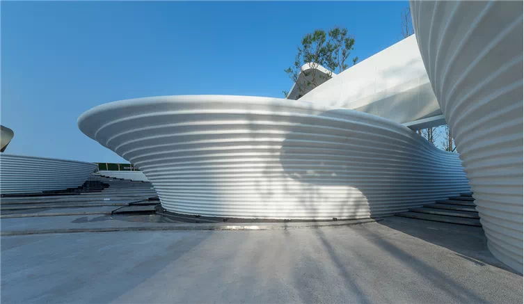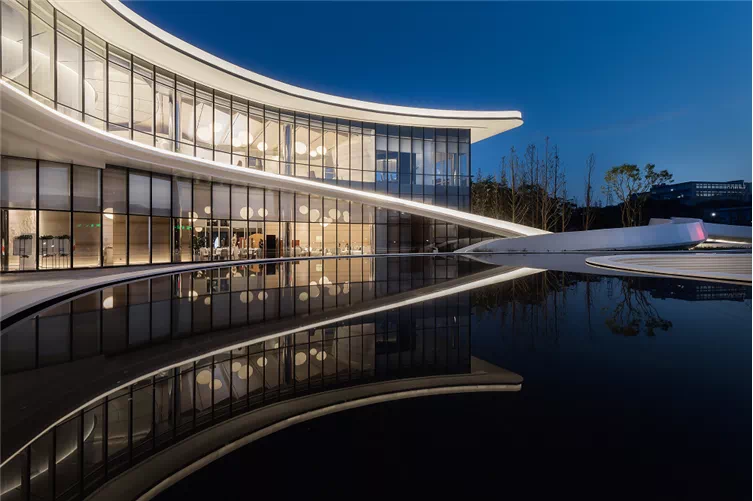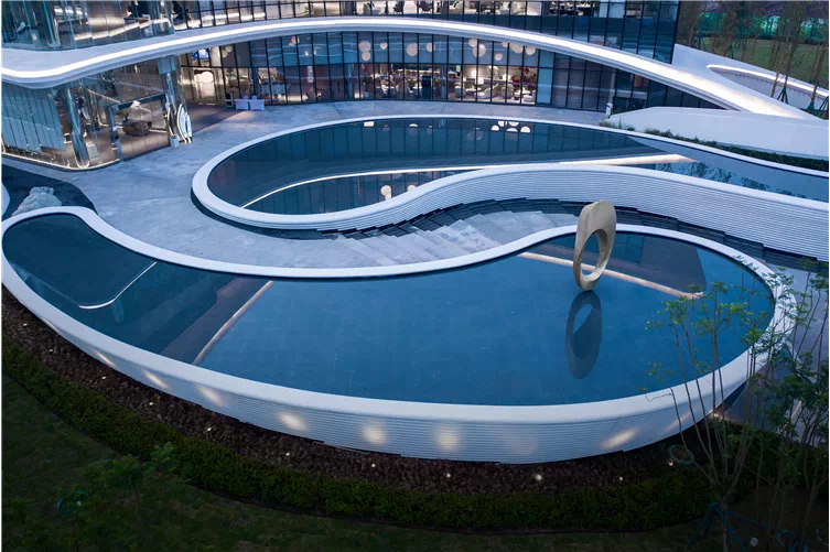 从前场进入,从售楼处到后场,3m的高差,成为“高台曡瀑,风吹麦浪”营造场地艺术的引爆点。到达售楼部标高,无边界镜面水面将其倒影其中。夜晚,池底星光斑斓。