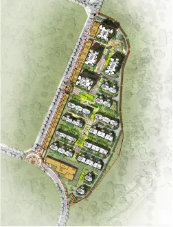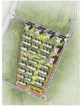 在规划布局上采用因地制宜的设计手法,西侧地块与东侧地块T9高层与洋房南北向布置,两个地块形成呼应;西侧地块两栋T8高层规划道路东西向布置,与东侧地块三栋T8形成组团;形成一横两纵两个大中庭多个景观节点的空间结构。