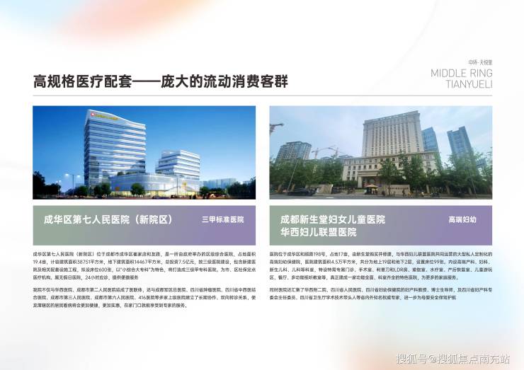 5. **医疗教育配套完善,带来人流消费**:项目正对面是按三甲标准修建的成华区第七人民医院,仅一街之隔,作为政府举办的区级综合医院,是市、区社保定点医疗机构;项目右侧是高规格私立医院——新生堂妇女儿童医院,为辖区居民提供了医疗便利。此外,项目南侧约500米处,成华区教育局与成都树德中学携手组建的成都和悦初级中学将于2025年内开工建设,这将为项目带来大量的流动性人群以及高质量消费力。