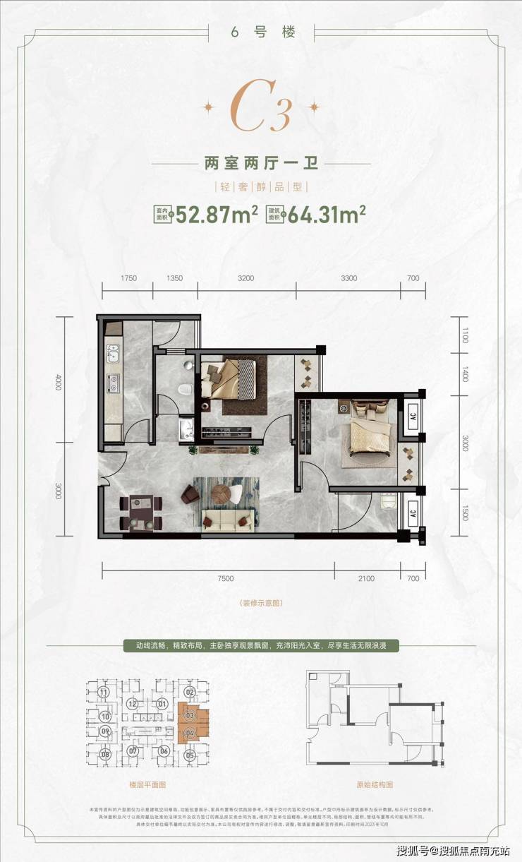 C3户型建面64.31-66.10㎡ 套内52.87-54.34㎡