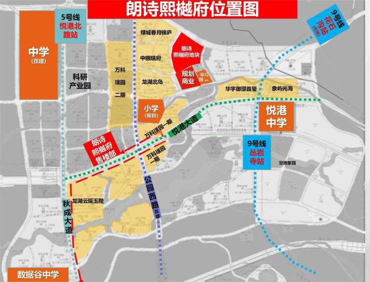 5号线-悦港北路站(直线距离约700米),9号线-花石沟站(直线距离约800米)、从岩寺站(直线距离约900米),14号线(规划中)