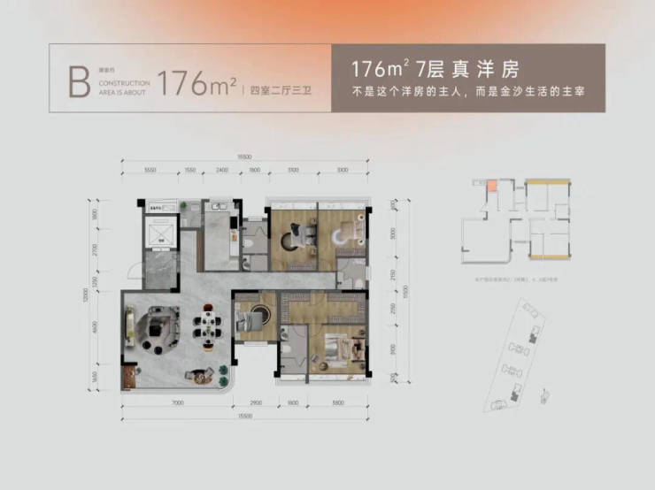 ;建面约 176㎡的户型同样为四室两厅两卫