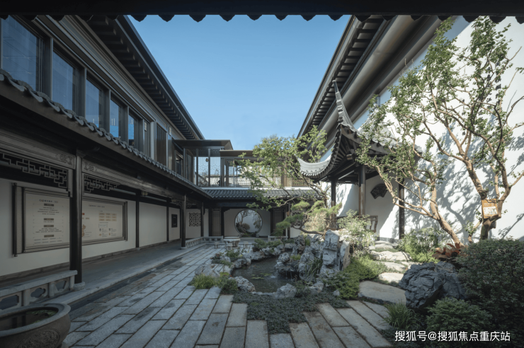 设计打造具有重庆城市文脉与自然特质的理想场所,师法苏州“可园”,其为苏州现存唯一的书院园林。“三声园”也因此而来,便是“风声雨声读书声,声声入耳”。设计中水池居中,布局疏朗,槛曲廊回,水木明瑟,庭宇清旷。紧扣一个“水”字,颇有妙趣,推开园门,步入门厅,映入眼帘的便是一泓碧水。空间由深入远,将空间划分为三进“青云阶”“三声园”“沧浪之水”。