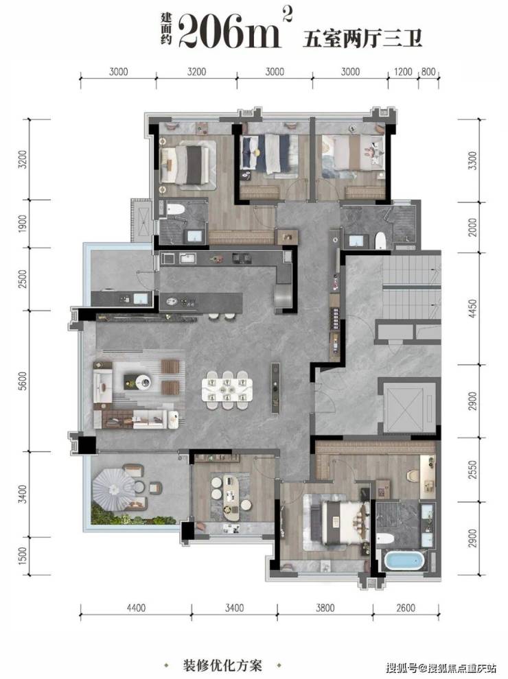 二、户型:面积段有173㎡四房三卫,以及约206㎡五房三卫,全2T2板式结构。