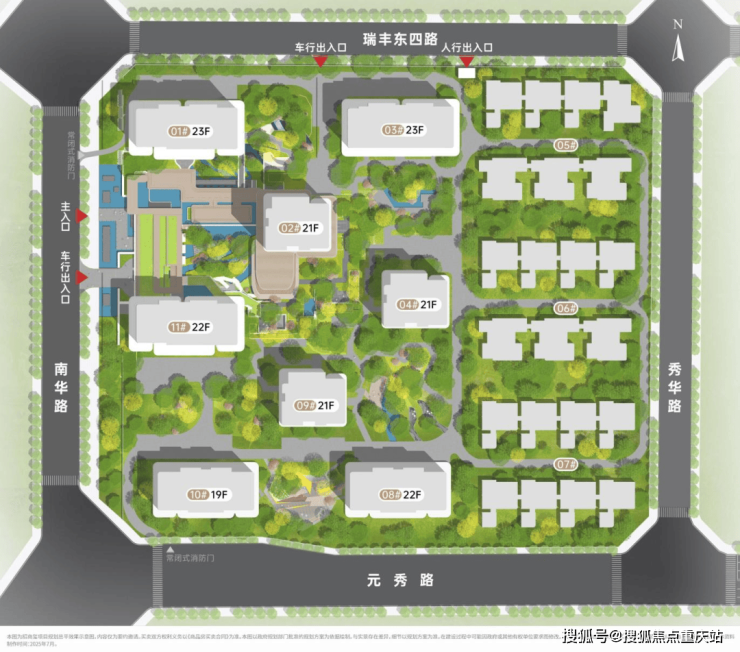 项目构建地下-地面-空中的多维生态体系,模糊景观边界,打造区别于传统四代住宅的居住场景。采用景观优先原则,楼栋南向围合排布,最大化楼间距;通过总平底盘抬高、入口“去坑化”处理、高层全架空等设计,提升项目独特性。