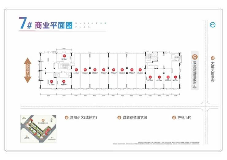 6、项目产品为多个十字路口铺,转角铺,小区门口铺,商铺临慢车道和主要人行路段,消费便利,消费频次更高,消费持续性更强,拥有强有劲的消费人群。