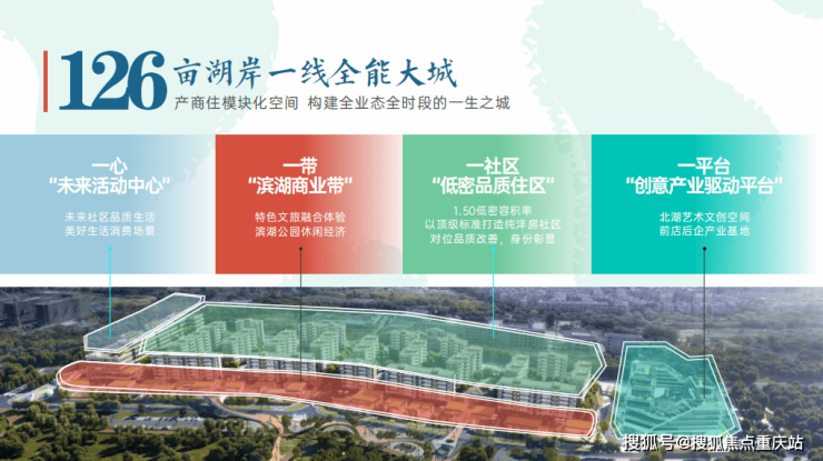 规划有“一心一带一社区一平台”,分别指“未来活动中心”、“湖滨商业带”、“创意产业驱动平台”、“低密品质住区”