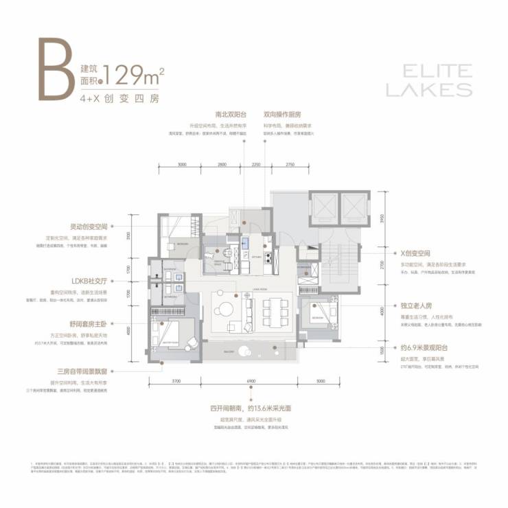 建面约129㎡4+X创变四房