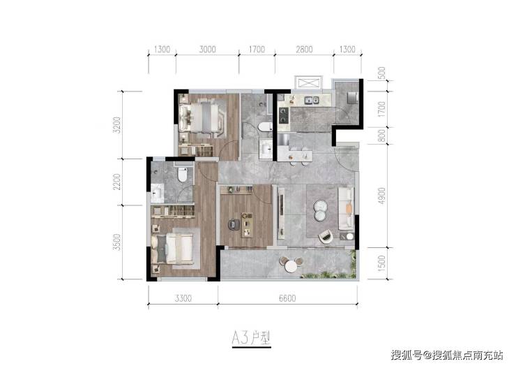 其中,94 平米的户型设计为套三双卫,还配备了 6.6 米的阳台