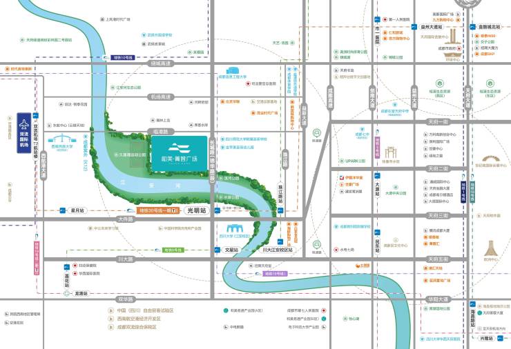 和美菁蓉广场位于成都市双流区临港路一段1号,紧邻久居福运动公园,区域人口超过60万,是双流区西航港街道的重要地标。项目周边交通网络四通八达,双地铁加持,距离换乘站光明站仅步行300余米,未来地铁30号线(预计2024年底建成通车)和15号线(规划中)将在此交汇,为居民出行提供极大便利。无论是前往城南生活圈还是其他区域,都能实现快速通达。