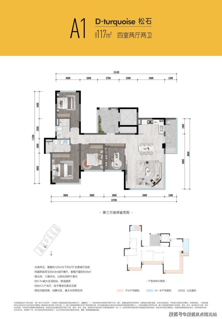 接下来为您进行户型鉴赏:117平户型亮点突出,是主城唯一建面120平米以下拥有270度全景端的户型。三面落地采光设计,使得室内阳光充足;4.3米超大生活阳台,有效拓展生活空间;全面屏落地玻璃(均无横向拼接),带来极致视野享受。