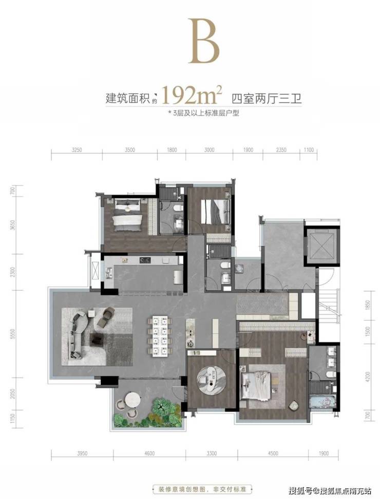 建面约192㎡端户客厅是完全悬挑的360°端厅设计,采光、视野超强;约3.2*4.6米超大尺寸的景观阳台在西门基本找不到,就这阳台已经把青羊老钱戳安逸了。