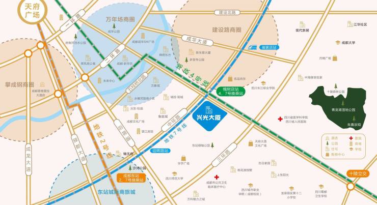 中环主轴:槐树店路与中环路交汇,即可快速抵达二环路、三环路,同时接驳龙潭立交、东至十陵客运枢纽,又可即时对接城南高速、成绵高速,实现城内城外通勤便捷畅通。