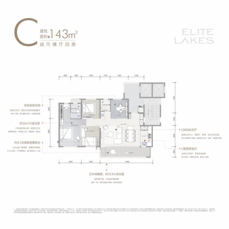 #### 建面约143㎡阔尺横厅四房在市场上同面积段产品中,其主功能区尺寸最大。LDKB社交厅设计,约6.9米大面宽的客餐厅与厨房、阳台无缝连通。约8.5米的宽景阳台,拥有270度广角视野,约1.8米的进深,为您塑造梦幻般的花园生活场景。五开间朝南,约15.9米的采光面,带来超宽屏尺度与无遮挡视野。约26㎡的大主卧,私享独立卫浴和衣帽间,双面观景设计让您仿佛置身度假胜地。此外,还有灵动创变空间,可根据家庭不同阶段的需求定制化布局,无论是书房、琴室还是娱乐室,都能随心打造。