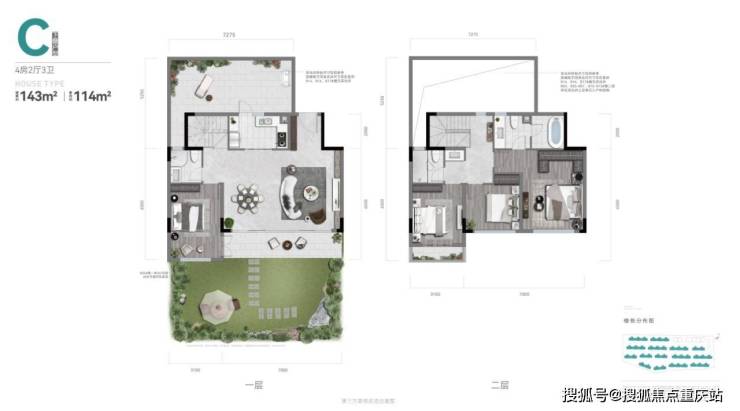 下叠建面约142㎡,它最大的亮点在于拥有约50-100㎡前庭后院的双重礼序,足以满足当代青年对别墅生活的一切美好幻想。