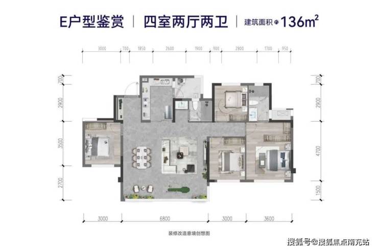 建面约136㎡精装四房,为市面上很受欢迎的四房横厅产品,客厅加景观阳台面积约40㎡,尺度奢阔的6.8m的宽厅、主面宽共计16.5m,独有的L形景观阳台保证通透采光和观景,堪称视野之王,这是购房者看到了一个接近满分户型的样子。