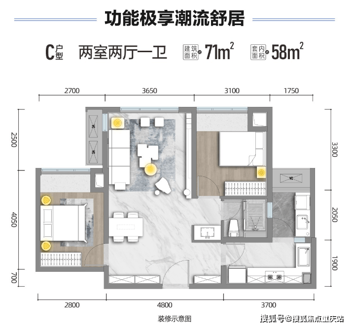 建面约71平套二